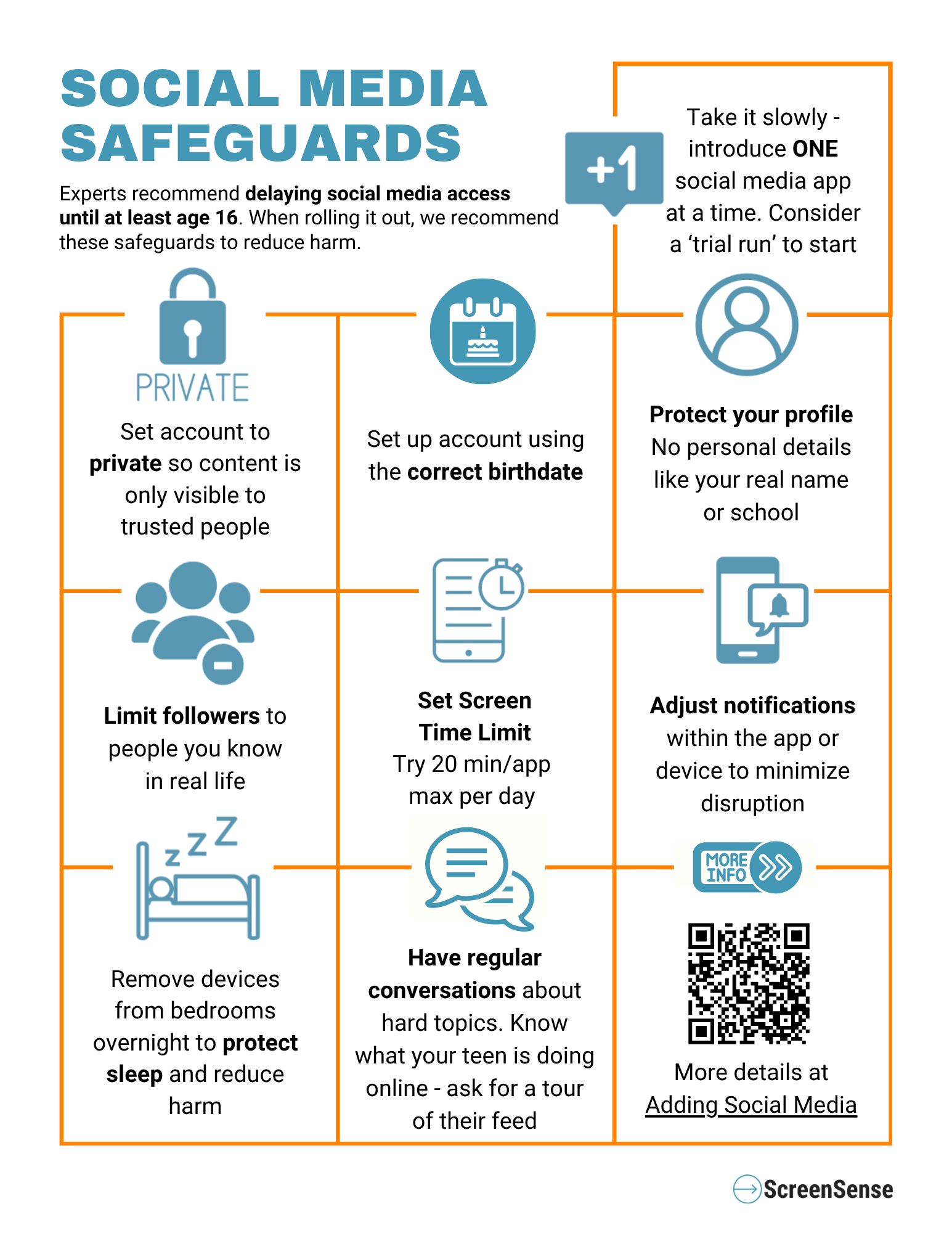 These safeguards will help you get started with some basic ground rules, and then from there, parenting a teen who’s on social media is a very iterative process with lots of check-ins, regular conversations, and adjustments. They’ll ask for more, you’ll make compromises, they’ll slip up, you’ll adjust their limits, and your child will test the boundaries. If it feels like messy ongoing work, then you’re doing your job. The safeguards aren’t foolproof so your best tool is open and honest conversations and creating an enviroment where your teen knows that they can come and talk to you about anything - without fearing judgement, ridicule, shaming or punishment.
