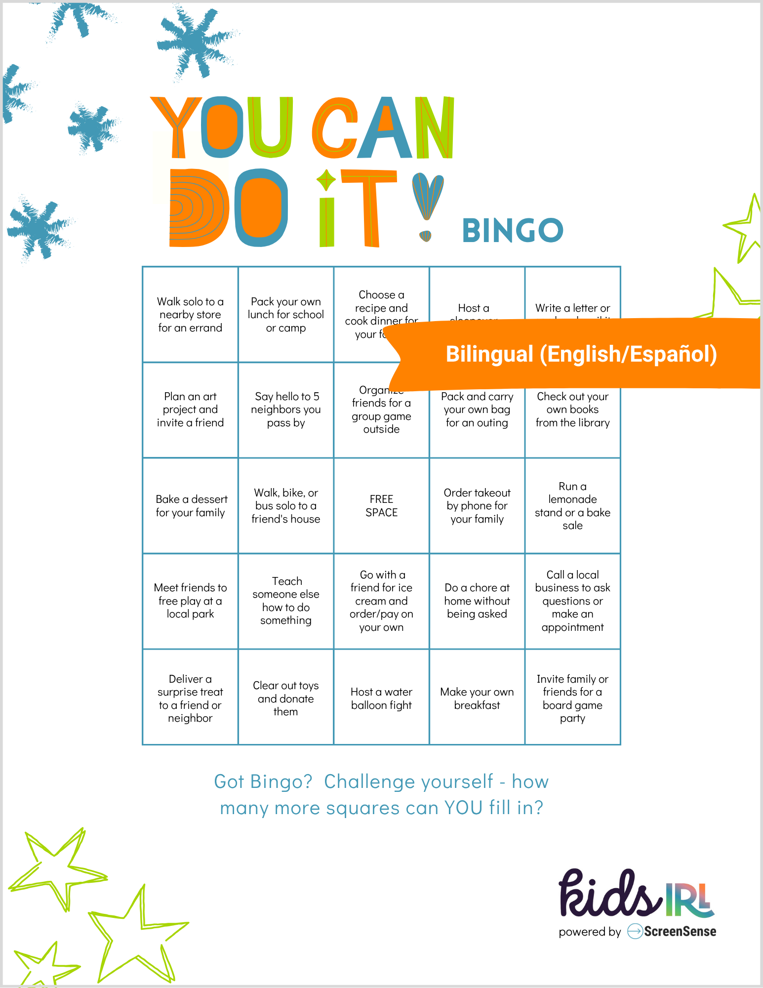 Practicing independence starts early. To help nudge younger kids towards independent activities and to help us adults get out of the way, we have created a playful Bingo card for elementary aged children. Print the Bingo card and have fun exploring what activities your child can do independently!