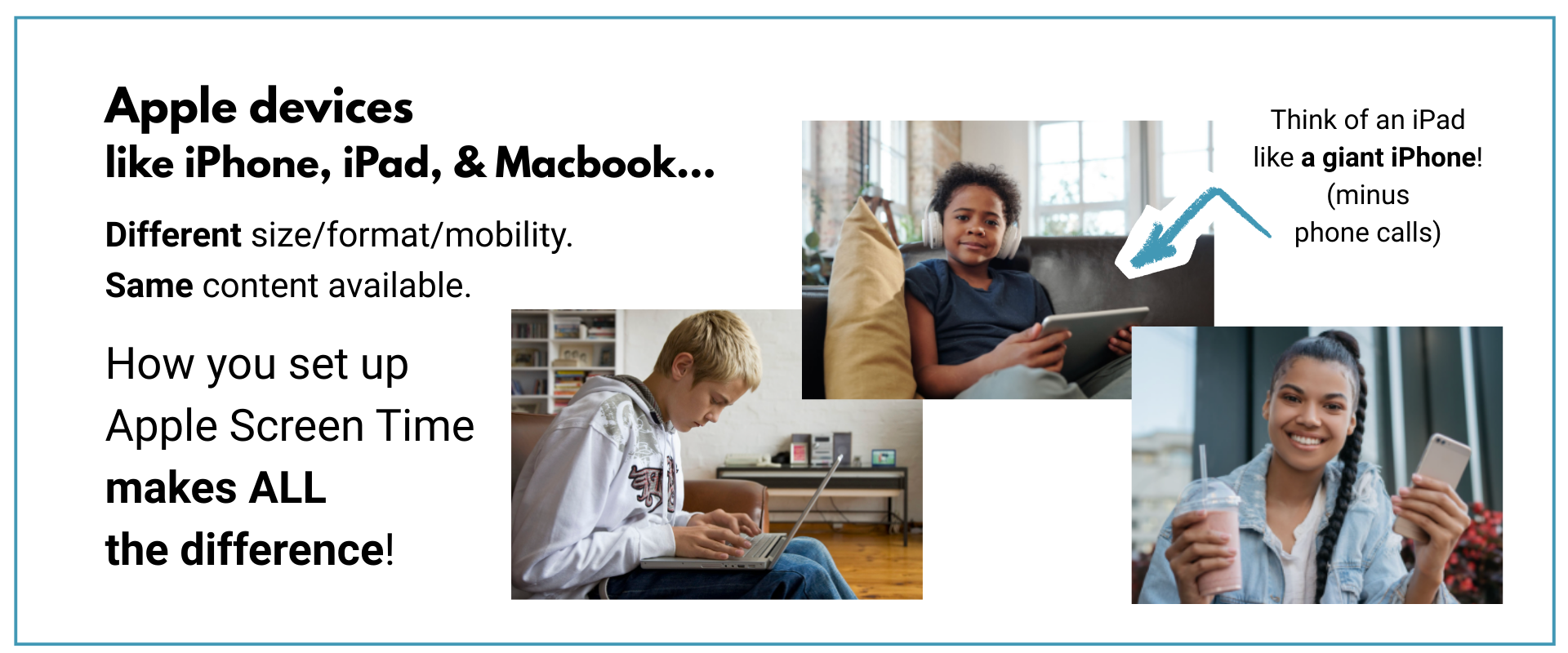 There is a lot to explore within Apple Screen Time. There are several features that we recommend parents/caregivers understand and use at a minimum to keep iPad, iPhone, and Macbook use in check. For those of you navigating an iPhone, we have a new resource, Simplying iPhones, which includes step-by-step video tutorials on how to set up a "simple" iPhone and limit access on an existing iPhone. It's NEVER too late to reel it device use!