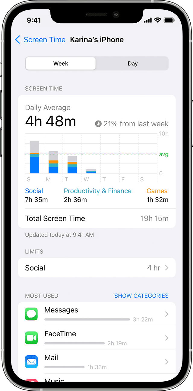 Time's up. Setting time limits on apps is a great way to rein in overuse. For older kids (tweens and teens) with social media apps, try 20 min per app. They can always ask for more time - which then gives you a chance to check in! Go to Settings > Screen Time > App Limits > Toggle on Add Limit. From there you can select all apps, or a category of apps (e.g. all Social), or a specific app (e.g. Instagram). You can also set time limits for specific websites (like YouTube.com)! Click Next > Set the time limit. You can customize the time limit by day of the week. Make sure to also toggle on "Block at end of limit"!
