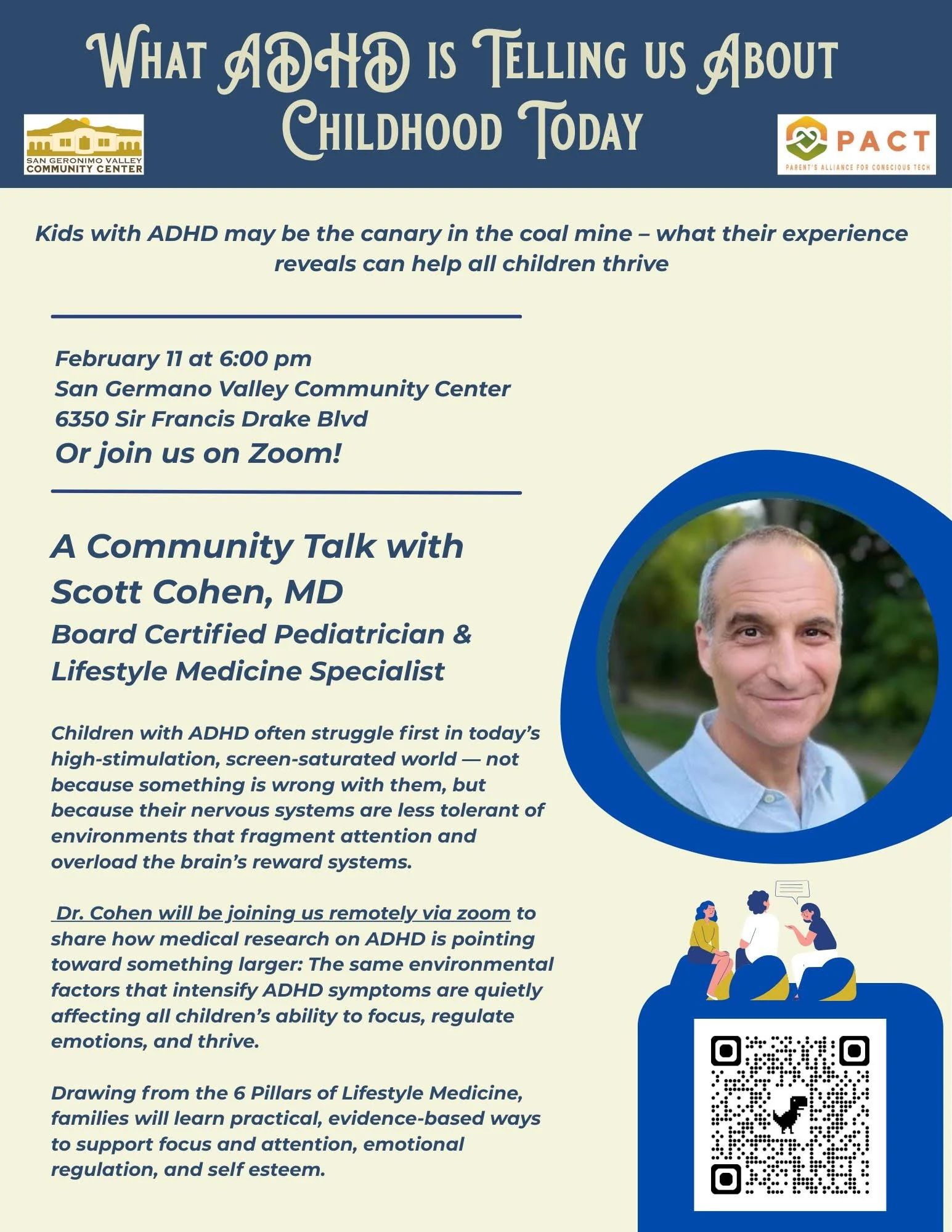 Join the Parent’s Alliance for Conscious Tech (an ally of ours based in San Geronimo Valley) for a community talk with Scott Cohen, MD, board-certified pediatrician and lifestyle medicine specialist, as he shares how emerging medical research on ADHD points to larger environmental factors affecting all kids. Drawing from the 6 Pillars of Lifestyle Medicine, families will learn practical, evidence-based strategies to support focus, emotional regulation, and self-esteem to help all children thrive.