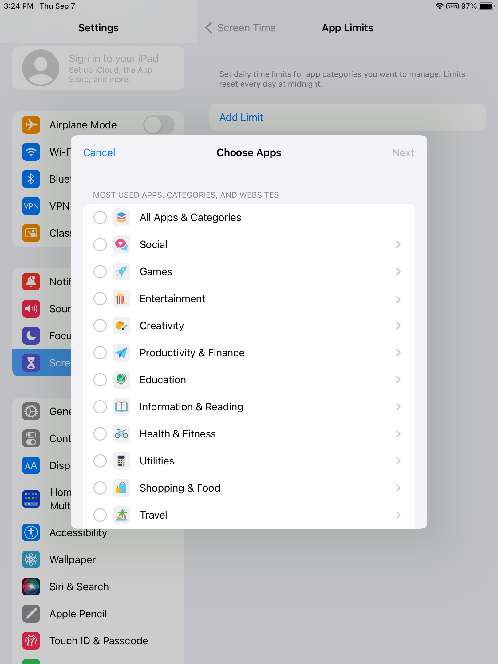 If you’d like to set a daily iPad time limit, click on “All Apps & Categories” and then “next.” Have your child try a 3.5 hour cap and see how that goes for a few days. Explain to your child what your expectations are for school iPad use and why you’re setting a limit.